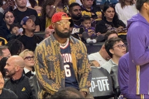 據(jù)現(xiàn)場記者Dan Woike分享的照片,本場因傷缺陣的詹姆斯身穿小兒子布萊斯在亞利桑那大學(xué)的球衣到場觀賽。