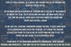 所以我們請(qǐng)求你們,從明天對(duì)陣牛津聯(lián)的比賽開始,請(qǐng)回到希爾斯堡球場(chǎng)為球隊(duì)加油助威。讓我們把這座球場(chǎng)變成客隊(duì)恐懼的地方,因?yàn)槲覀儗⒔弑M所能去爭(zhēng)取我們?nèi)绱似惹行枰姆e分。