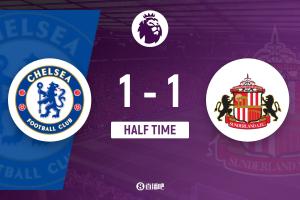 上半場傷停補(bǔ)時(shí)3分鐘,半場結(jié)束,切爾西暫1-1桑德蘭。