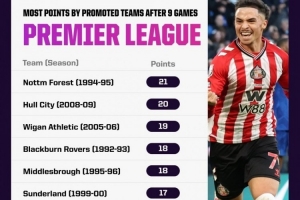 桑德蘭聯(lián)賽前9輪豪取17分!在英超歷史升班馬同期戰(zhàn)績并列第6位