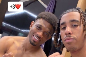 約羅也在賽后通過社媒曬出自己和阿瑪?shù)略谫惡蟾率页嗦闵习肷淼淖耘恼?,兩人看起來都相當開心,約羅還配文道:“+3分”。