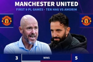 24-25賽季,滕哈赫帶隊:前9輪3勝2平4負,積11分,場均1.22分,聯(lián)賽第14位
