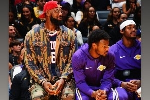 體育資訊10月26日訊 昨日湖人主場迎戰(zhàn)森林狼,詹姆斯身穿小兒子布萊斯在亞利桑那大學(xué)的球衣到場觀賽。