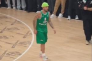畫(huà)面中比伯身穿一件綠色6號(hào)球衣,頭戴“小綠帽”,連連得分。