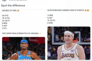 賽后美媒露天看臺曬出了里夫斯的數(shù)據(jù)但沒寫上罰球數(shù)據(jù),而此前亞歷山大對步行者砍下55分的比賽數(shù)據(jù)卻有寫上罰球,雷霆隨隊記者Clemente Almanza對此寫道:“發(fā)現(xiàn)了區(qū)別?!?/p>