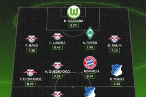 后衛(wèi):巴庫(萊比錫,7.38分)、盧克巴(萊比錫,8.46分)、阿莫斯-皮佩爾(云達不萊梅,7.98分)、勞姆(萊比錫,7.15分)