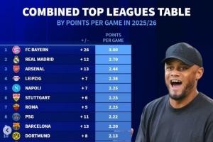 體育資訊10月28日訊 《轉(zhuǎn)會(huì)市場》更新了本賽季五大聯(lián)賽球隊(duì)的場均拿分情況,拜仁、皇馬、阿森納分列前三。