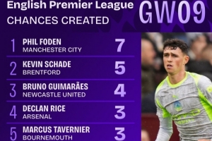 英超第9輪創(chuàng)造機(jī)會榜:福登7次居首,沙德5次第二,吉馬良斯4次