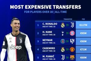 30歲以上球員轉(zhuǎn)會(huì)費(fèi)榜:
