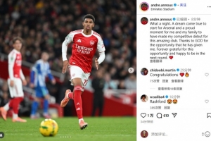 安努斯寫道:“多么美妙的夜晚。為阿森納首發(fā)是夢(mèng)想成真,我和家人都為我為這家了不起的俱樂部完成正式首秀而感到自豪。感謝上帝賜予我的這個(gè)機(jī)會(huì),永遠(yuǎn)感激這次機(jī)遇,并為成功晉級(jí)下一輪感到開心。??”