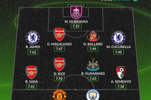 中場:薩卡(阿森納)、賴斯(阿森納)、吉馬良斯(紐卡斯爾)、塞梅尼奧(伯恩茅斯)