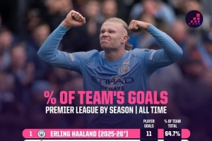 體育資訊10月31日訊 Opta統(tǒng)計了球員單賽季英超進球在球隊的占比,并列出榜單,本賽季哈蘭德占比64.7%最高。