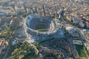 航拍圖像顯示,第三層看臺(tái)是改進(jìn)空間最大的部分。在第二層和第三層看臺(tái)之間將設(shè)置VIP包廂環(huán)廊,這是新諾坎普球場(chǎng)的重大亮點(diǎn)之一。