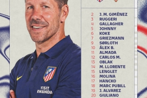 前鋒:7-格列茲曼、9-瑟爾洛特、11-阿爾馬達、19-阿爾瓦雷斯、20-朱利亞諾-西蒙尼、22-拉斯帕多里、23-尼古拉斯-岡薩雷斯