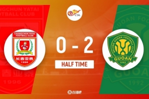 傷停補(bǔ)時(shí)7分鐘。上半場比賽結(jié)束,長春亞泰0-2北京國安。