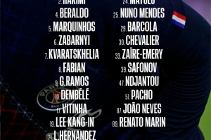 中場:8-法比安、17-維蒂尼亞、24-馬尤盧、33-扎伊爾-埃梅里、87-若昂-內(nèi)維斯
