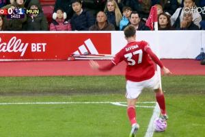但慢鏡頭顯示,森林后衛(wèi)控球未出界,主裁判仍然判給曼聯(lián)角球。