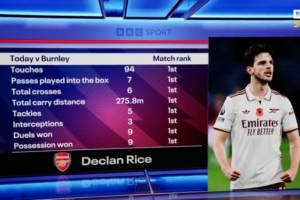 體育資訊11月2日訊 英超第10輪比賽,賴斯破門,阿森納客場2-0擊敗伯恩利,據(jù)BBC統(tǒng)計(jì),此役賴斯觸球、搶斷、攔截等多項(xiàng)數(shù)據(jù)全場居首。