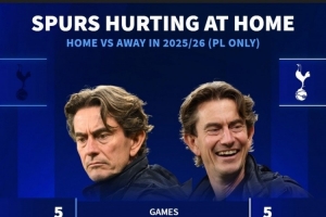 熱刺本賽季英超主場戰(zhàn)績1勝1平3負(fù),打進5球丟掉5球,客場4勝1平保持不敗,打進12球僅丟3球。