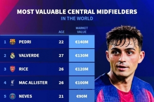 體育資訊11月2日訊 德國轉(zhuǎn)會市場列出了中場中路球員(Central Midfielders)身價(jià)排名,佩德里、巴爾韋德、賴斯前三。