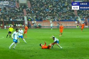 比賽第43分鐘,宋浩宇防守時被倒地的羅競踢到襠部,隨后隊醫(yī)進場治療。