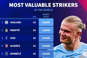體育資訊11月3日訊 德轉(zhuǎn)列當(dāng)前世界足壇中鋒身價(jià)排行,哈蘭德、姆巴佩1.8億歐并列最高,伊薩克1.4億歐,阿爾瓦雷斯、登貝萊1億歐。