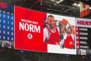體育資訊11月4日訊 快船主場(chǎng)迎戰(zhàn)熱火,首節(jié)暫停期間,球隊(duì)播放了致敬舊將鮑威爾的視頻,鮑威爾也鼓掌致謝。